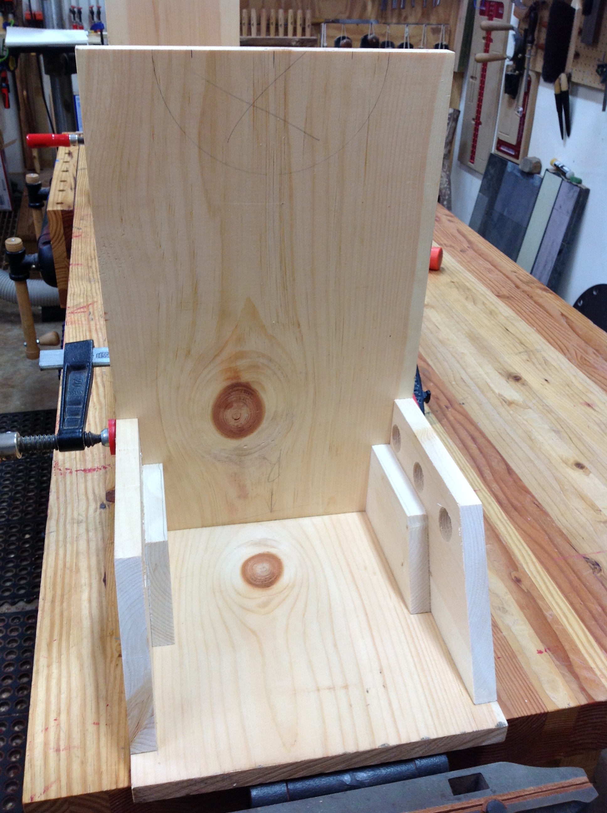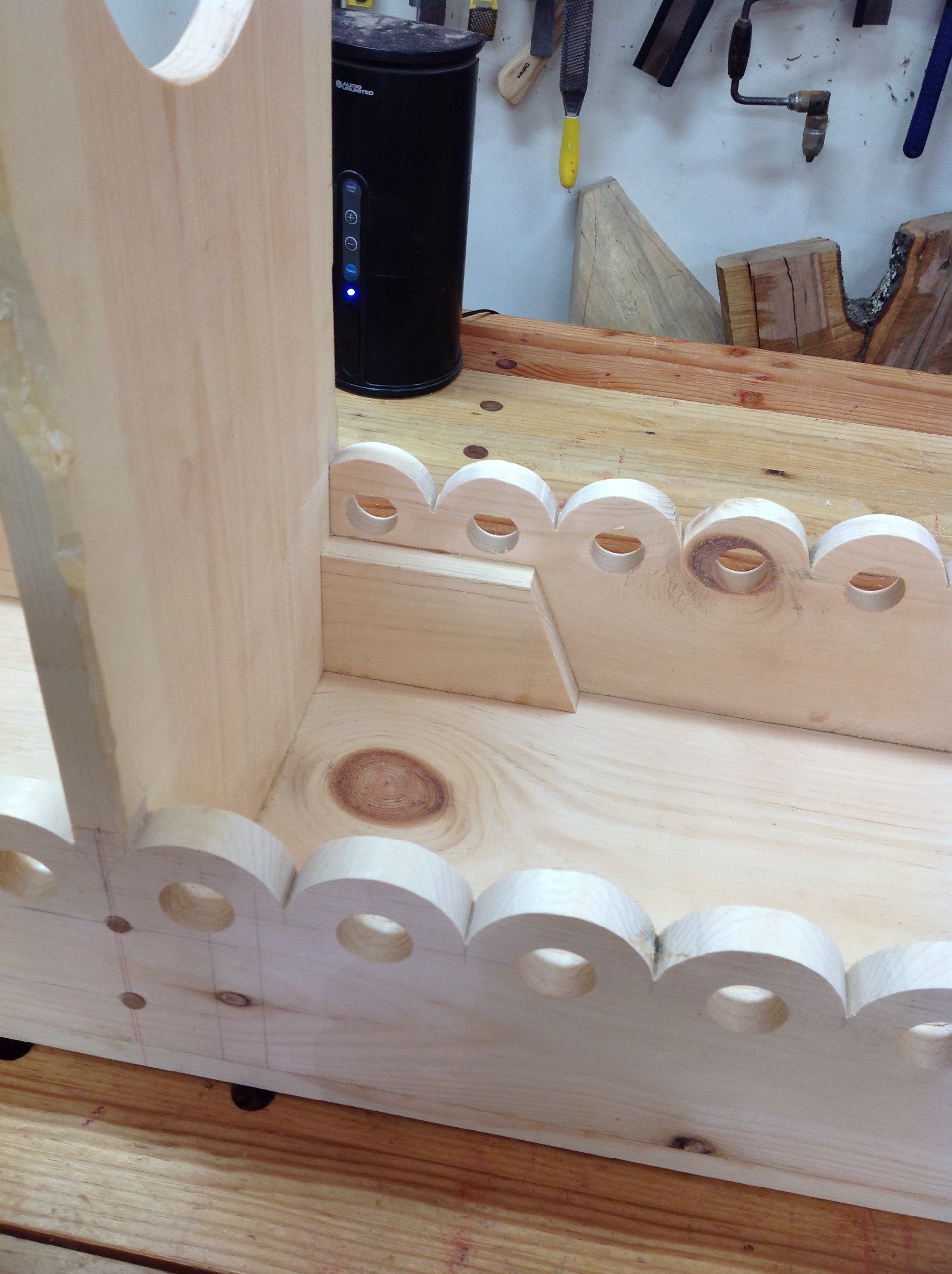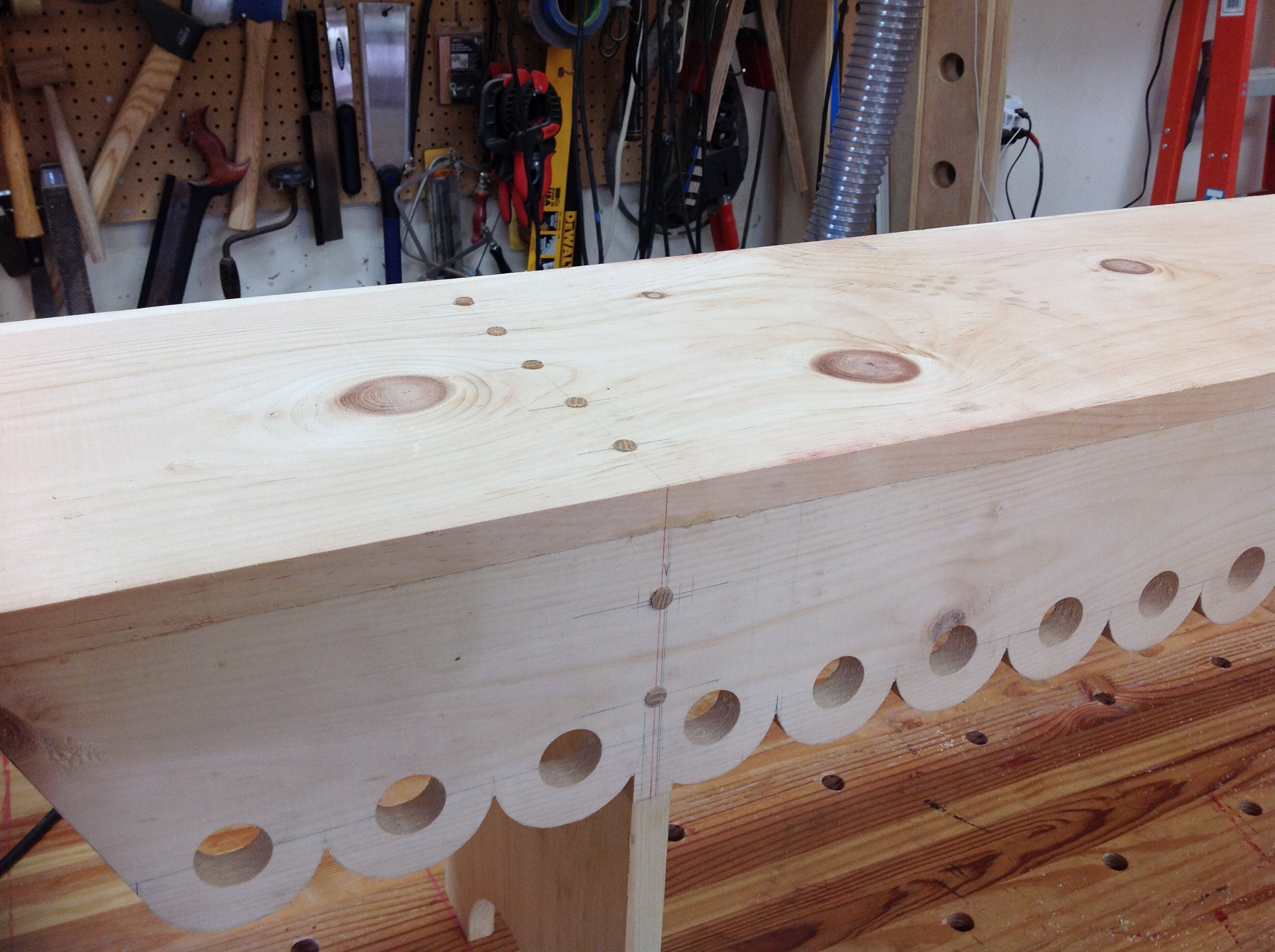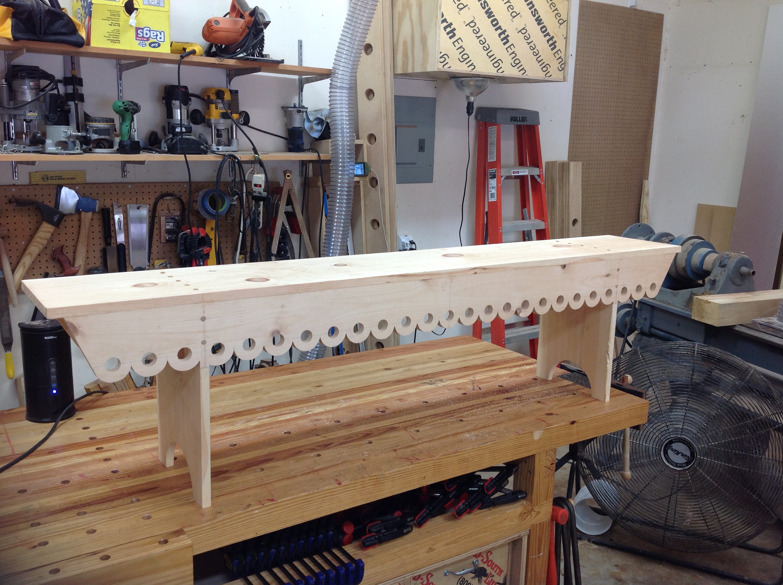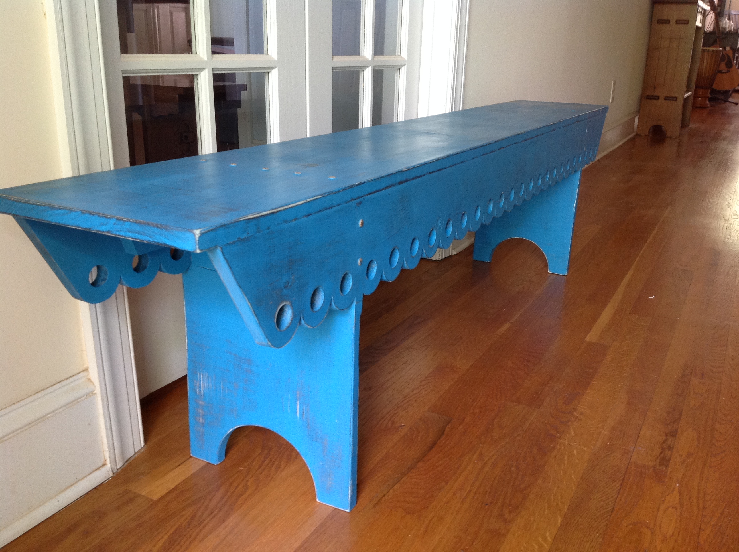 This simple, sturdy, traditionally built pine bench is the perfect way to welcome guests into your home. It can easily fit into a hallway, in front of a bed, at the dining table, or on your front porch! This bench features traditional scalloped shaped front and rear support rails. No metal fasteners are used in my work. Each of the legs is fastened and supported using hardwood dowels and support blocks.