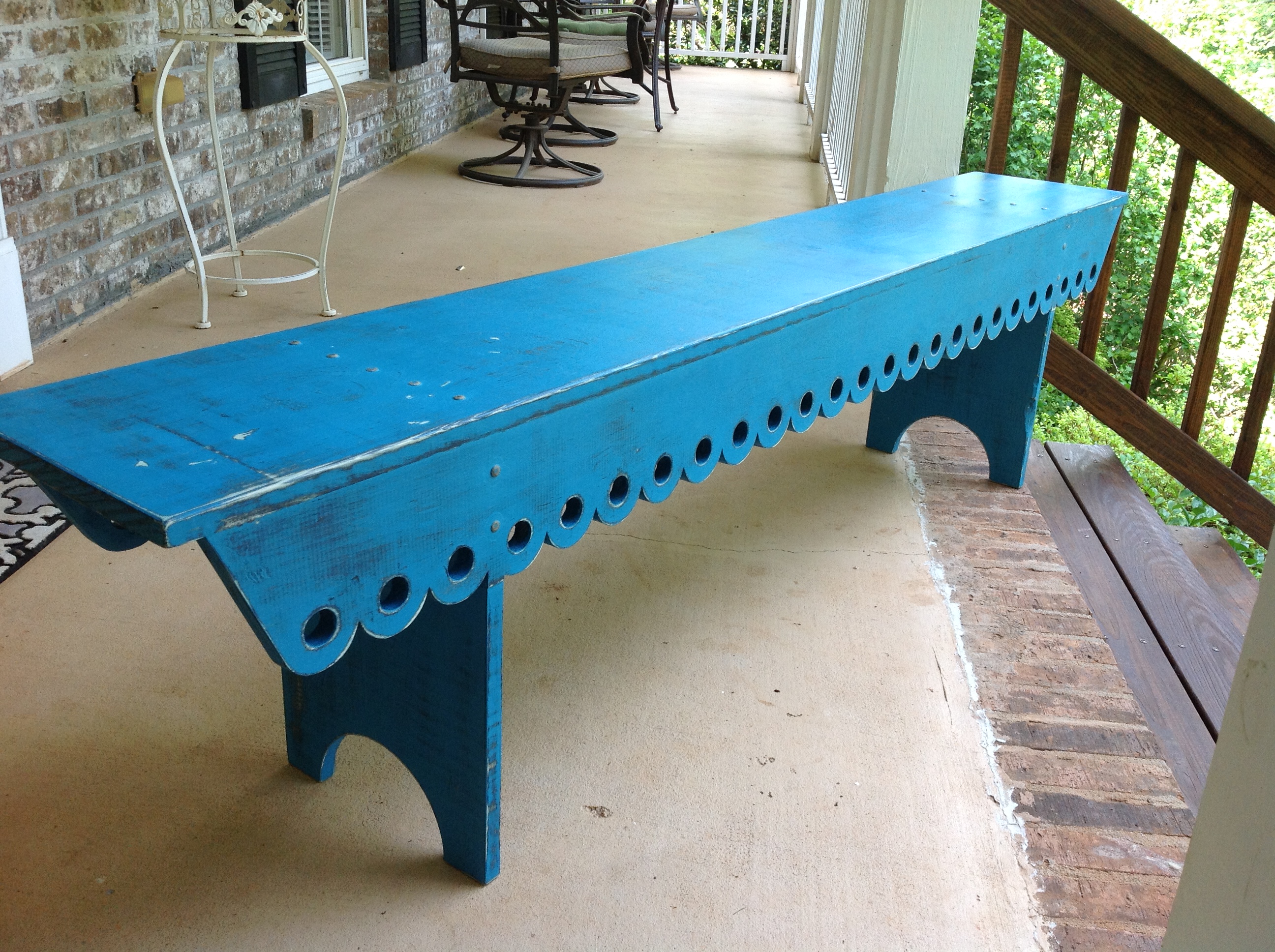 You may request a custom set of paint colors or stain if you wish to have a custom finished bench to match your decor. The bench for sale is painted with a black base coat and then painted a lovely blue. Following painting, extensive hand sanding and distressing is completed to give each bench a one of kind look.
