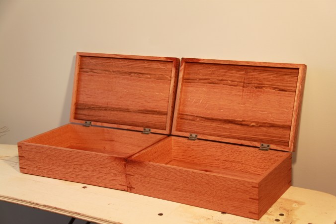 These boxes are made from quartersawn white oak and are unique in that they are mirror images of one another. If you were to rotate the boxes around next to each other, each face is a mirror image of the opposing box. The corners are mitered for a seamless transition of grain from one face to the next and reinforced with keys which get wider from top to bottom. The top and bottom panels are book matched and mirror imaged as well. These two boxes are made from one 2″ thick, quartersawn board. I can reproduce this or any wooden box design upon request. If you are interested in purchasing a similar piece or pair of boxes, please contact me for pricing and availability as I don’t normally make these pieces.
