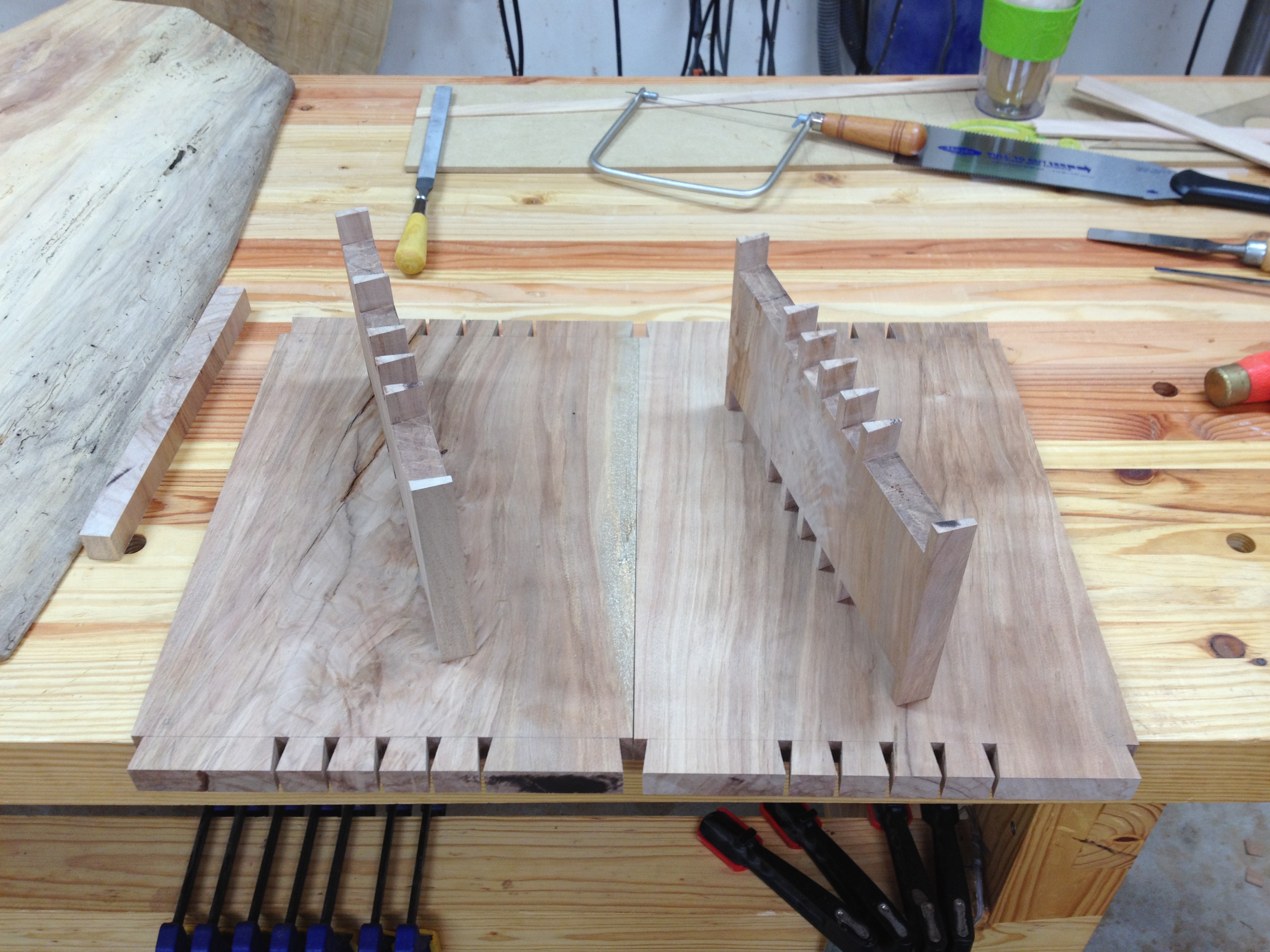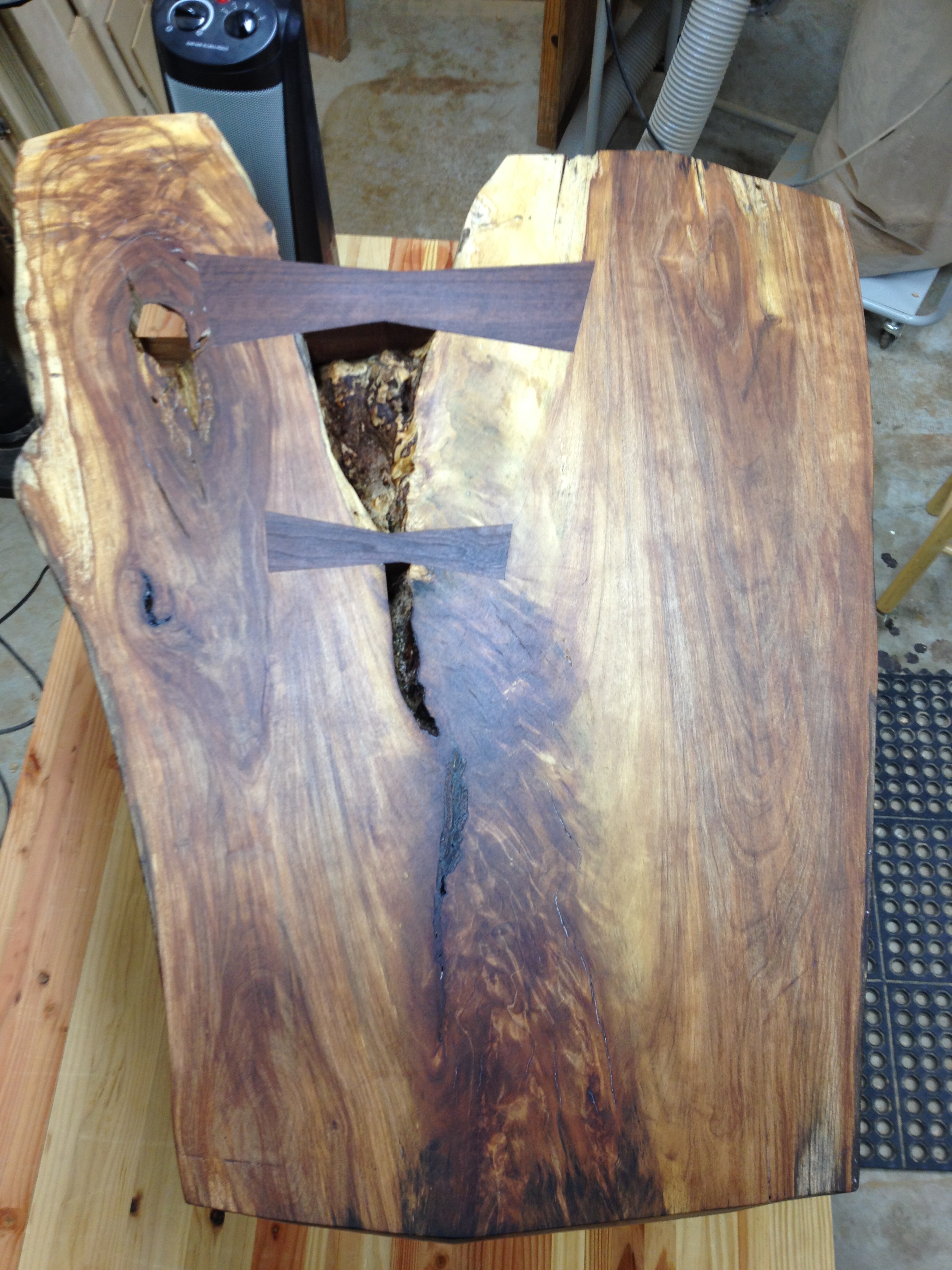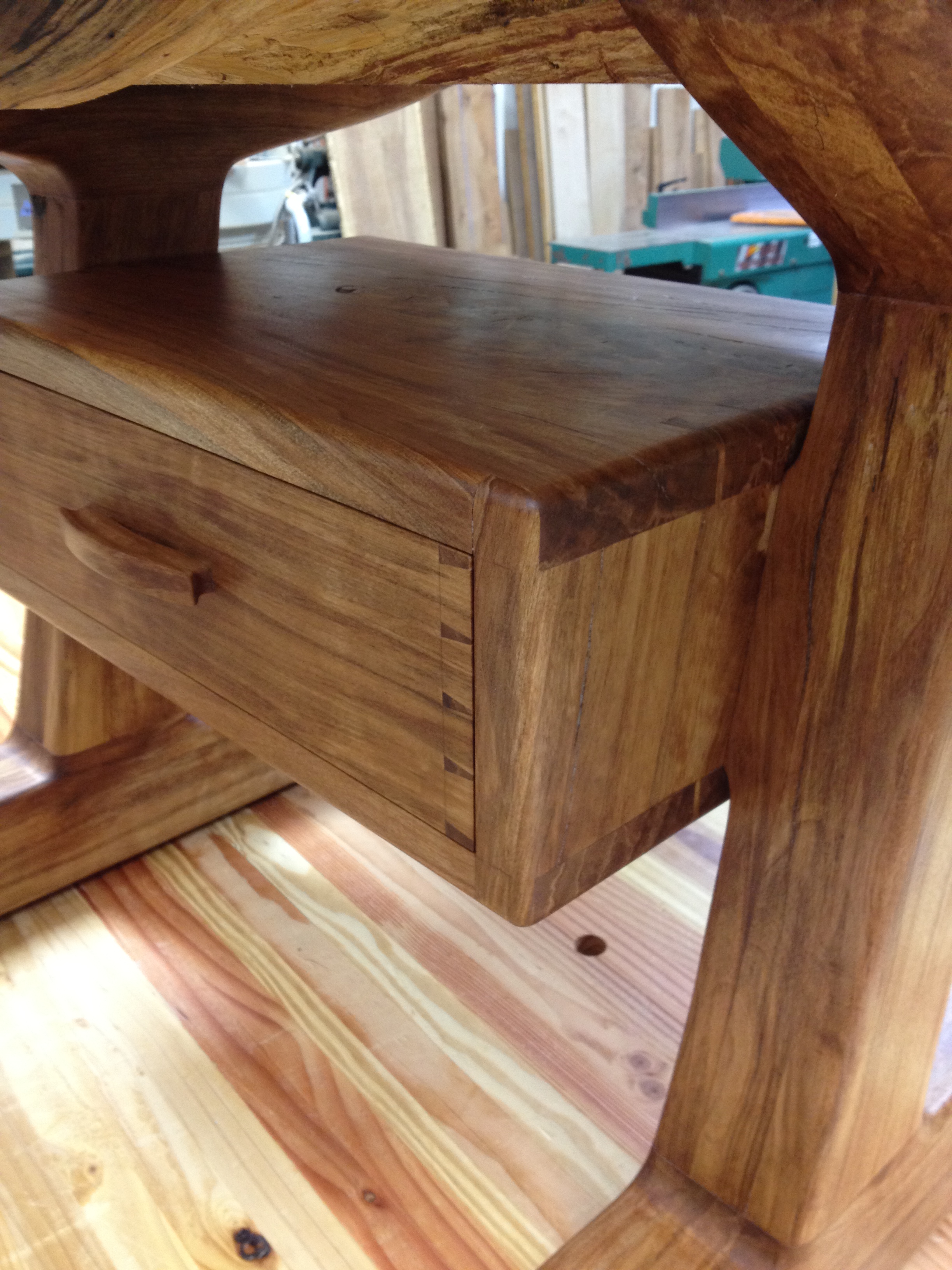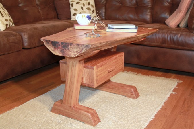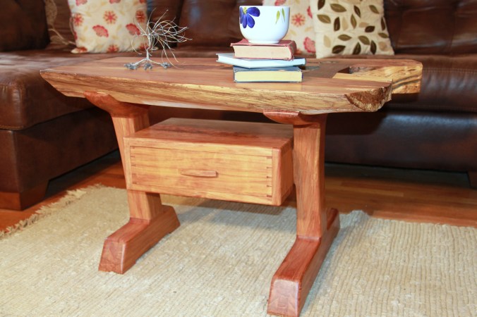 This coffee table represents a mixture of popular furniture styles including live edge slabs and danish modern elements. The top is a crotch cut of cherry with two very large walnut butterfly keys. The base is an interpretation of the danish modern style with cantilevered legs and a floating drawer box. The drawer box is made from one piece of cherry and the wood grain continues all the way around the box. The drawer and drawer box are built using hand cut dovetails.