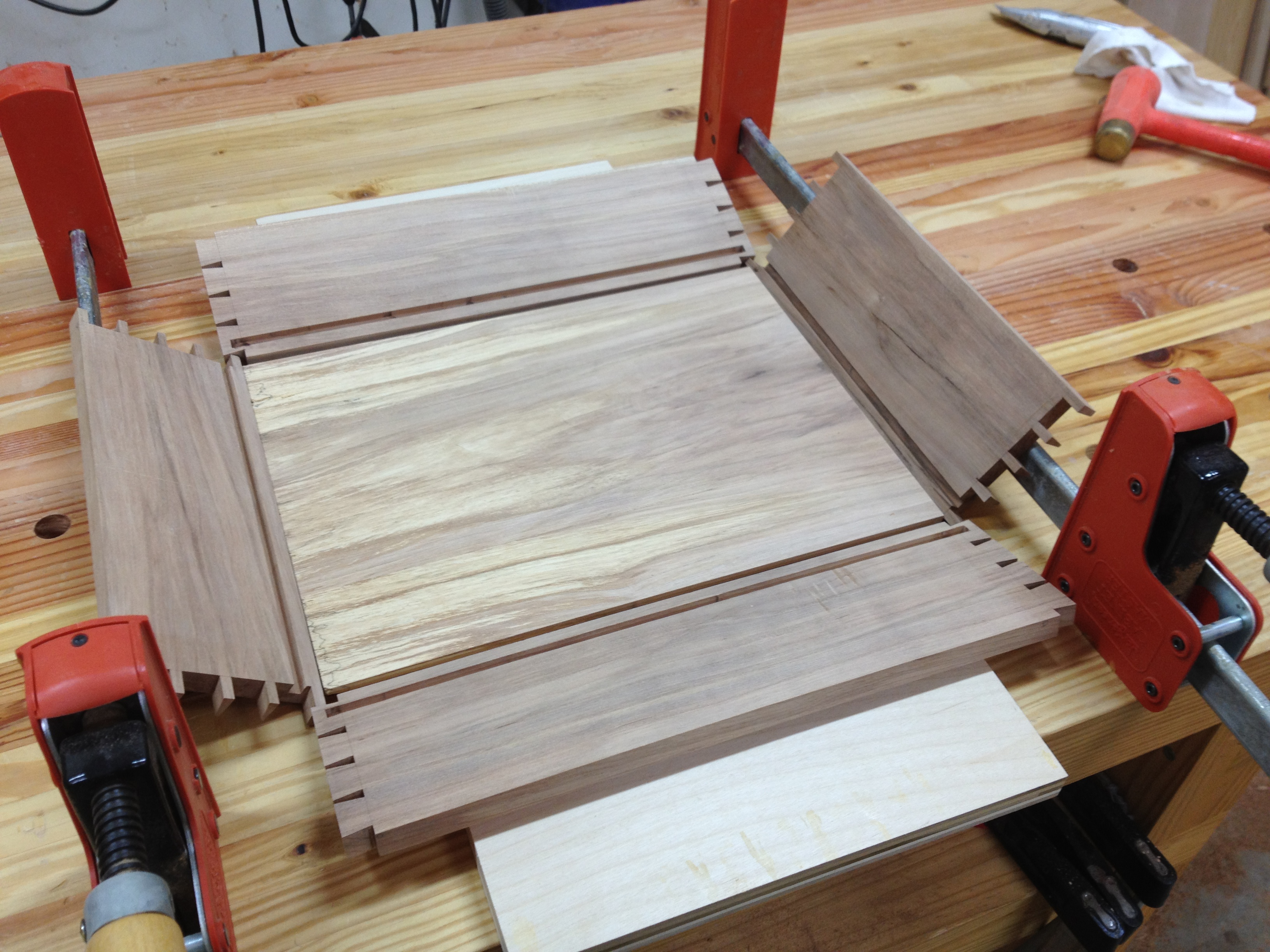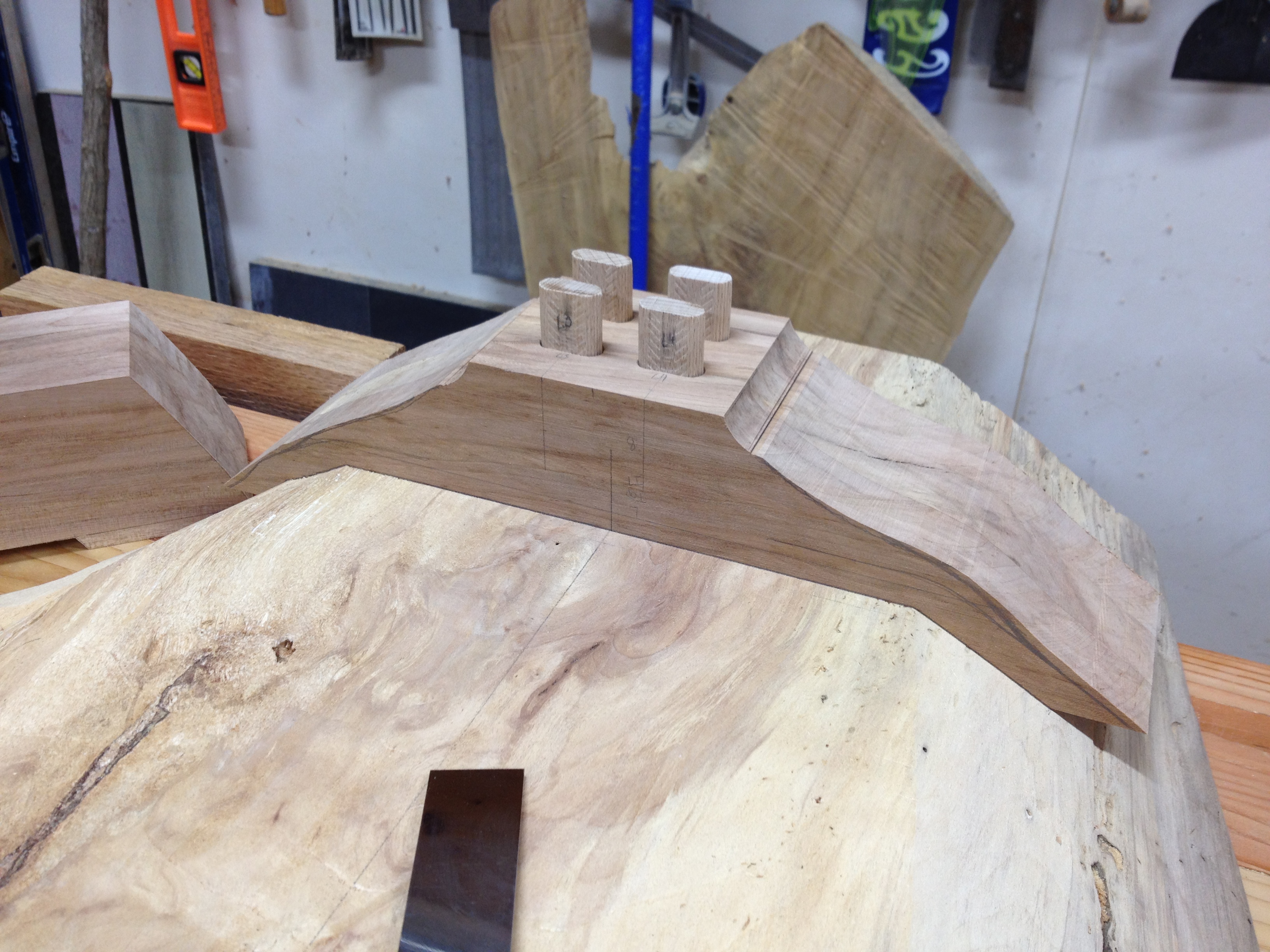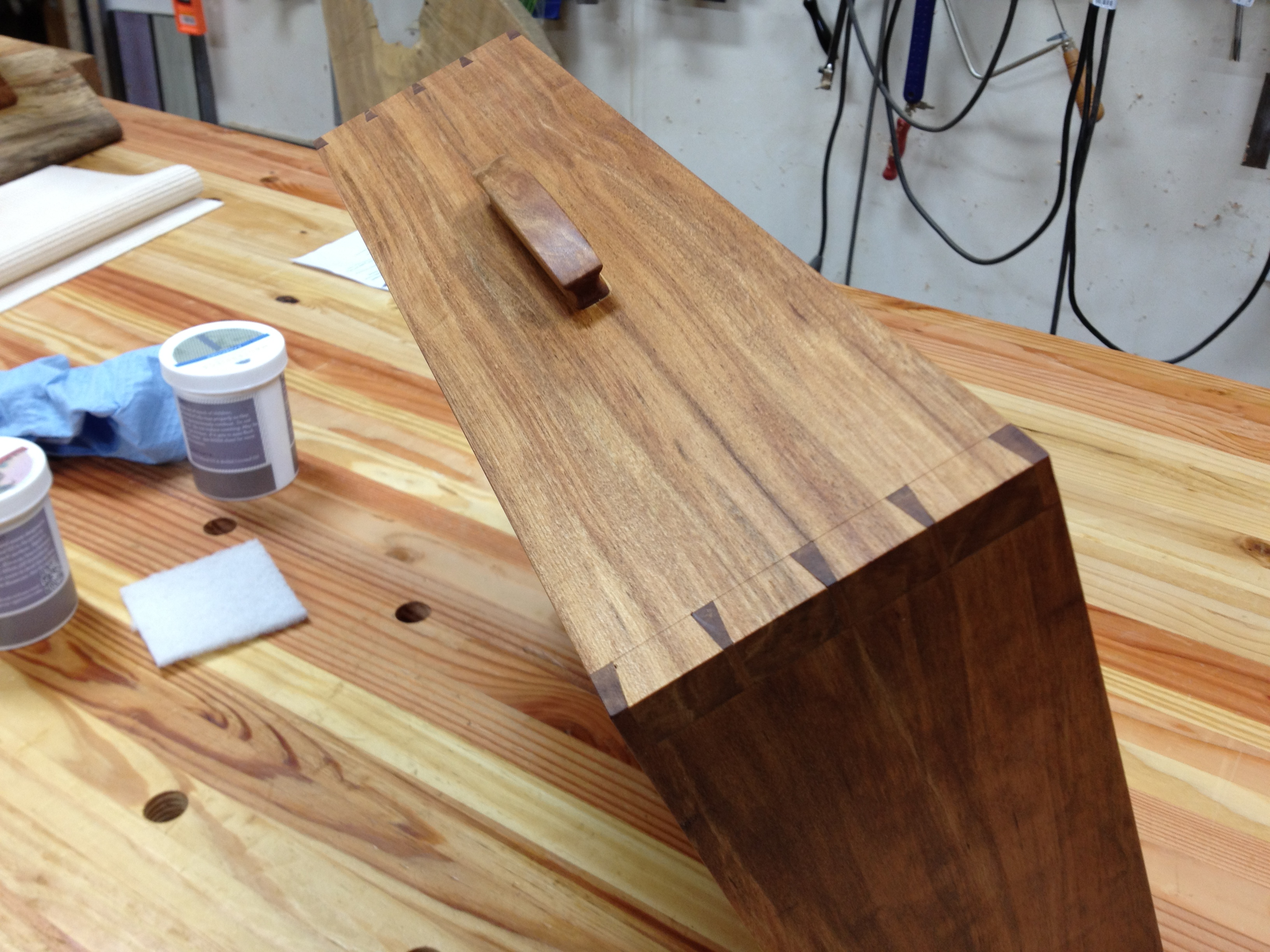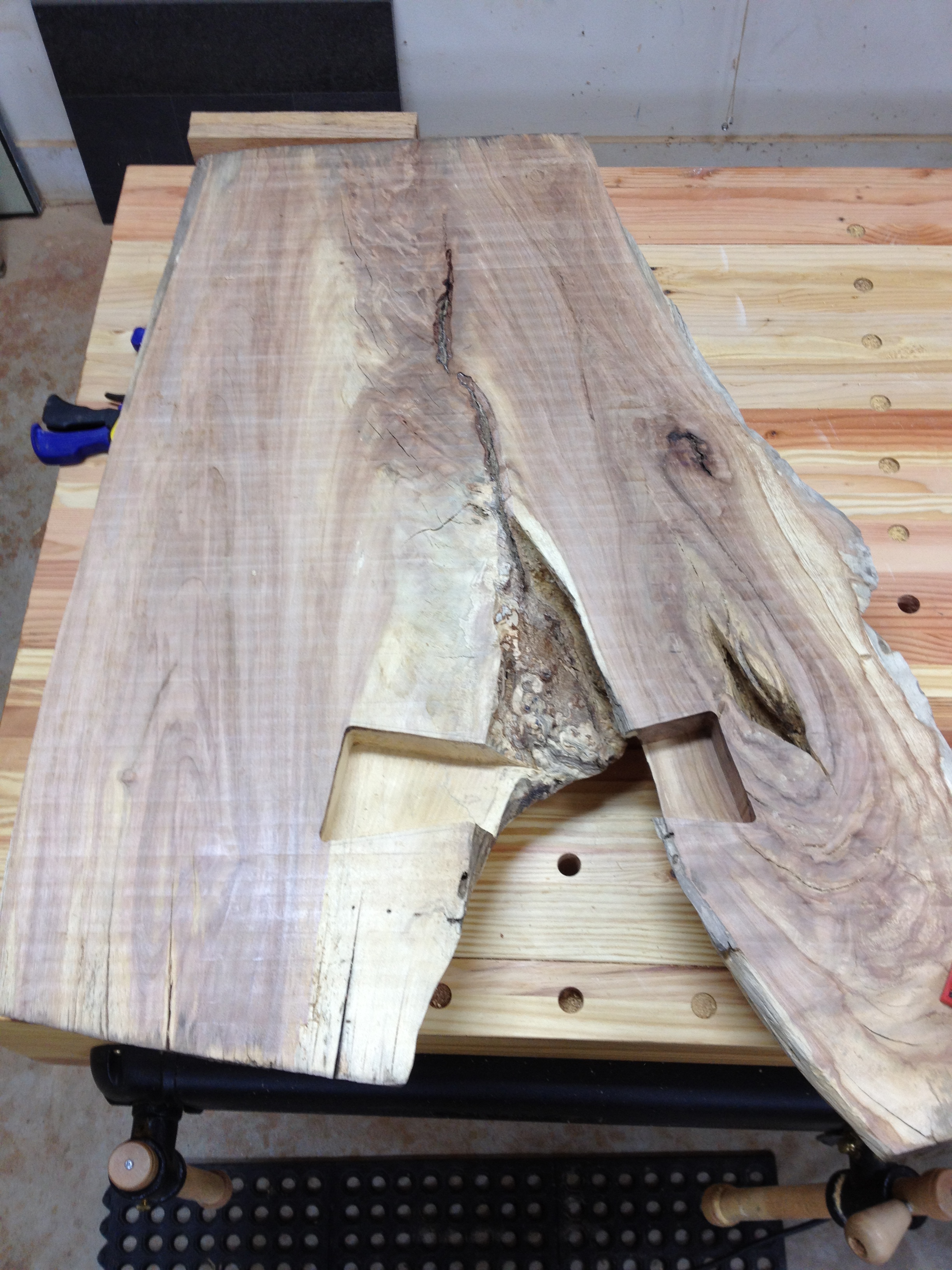 This coffee table represents a mixture of popular furniture styles including live edge slabs and danish modern elements. The top is a crotch cut of cherry with two very large walnut butterfly keys. The base is an interpretation of the danish modern style with cantilevered legs and a floating drawer box. The drawer box is made from one piece of cherry and the wood grain continues all the way around the box. The drawer and drawer box are built using hand cut dovetails.