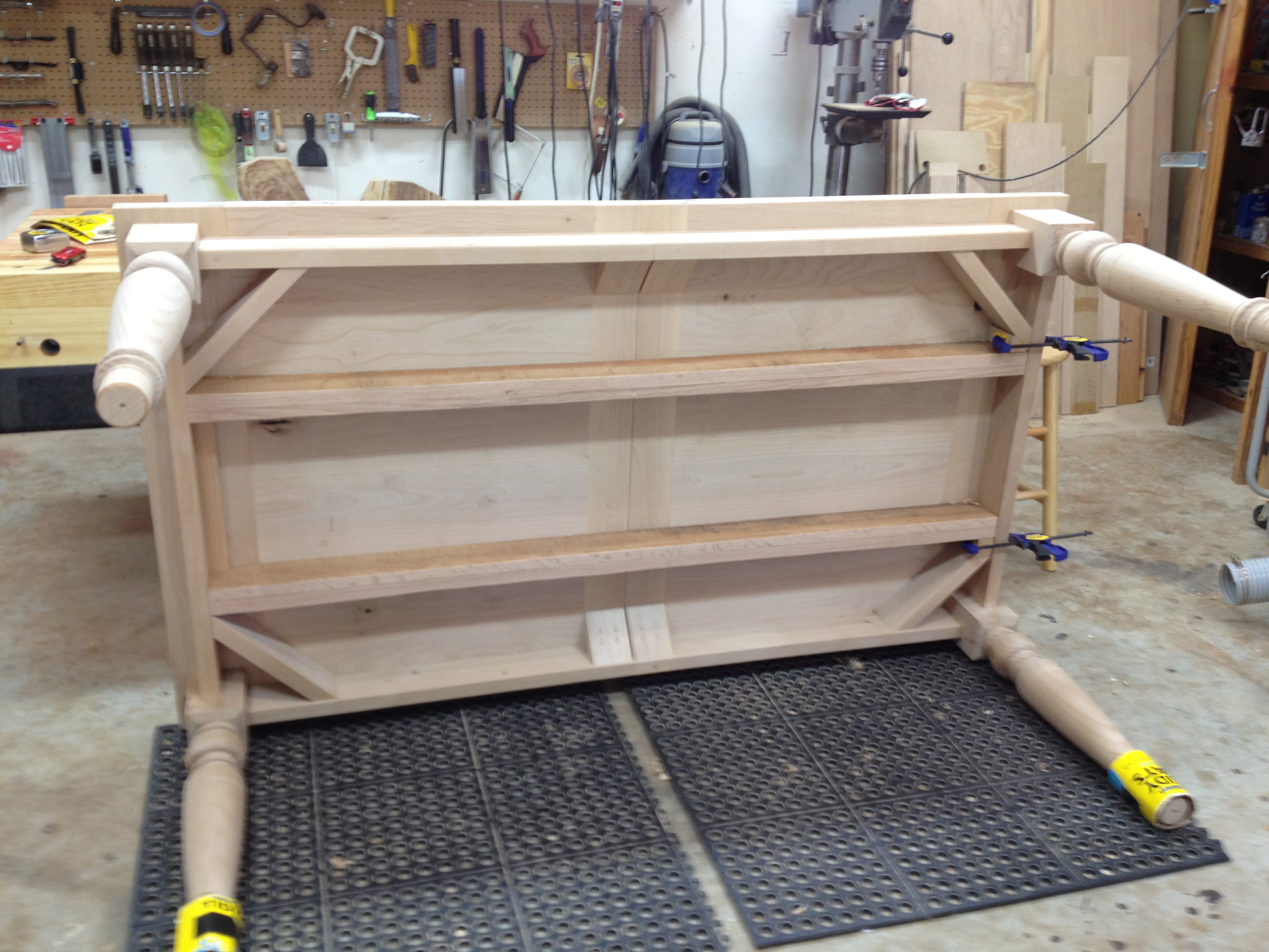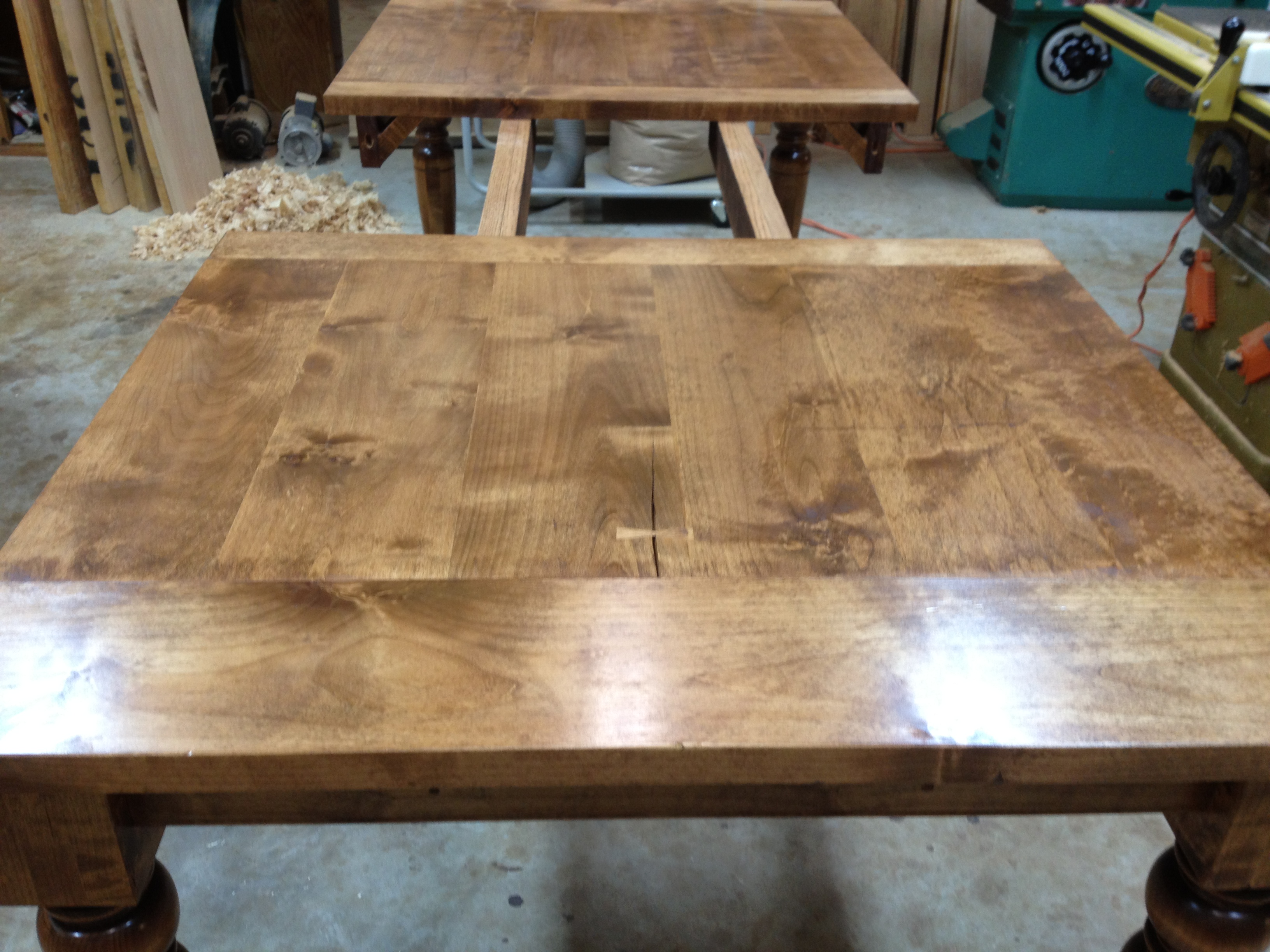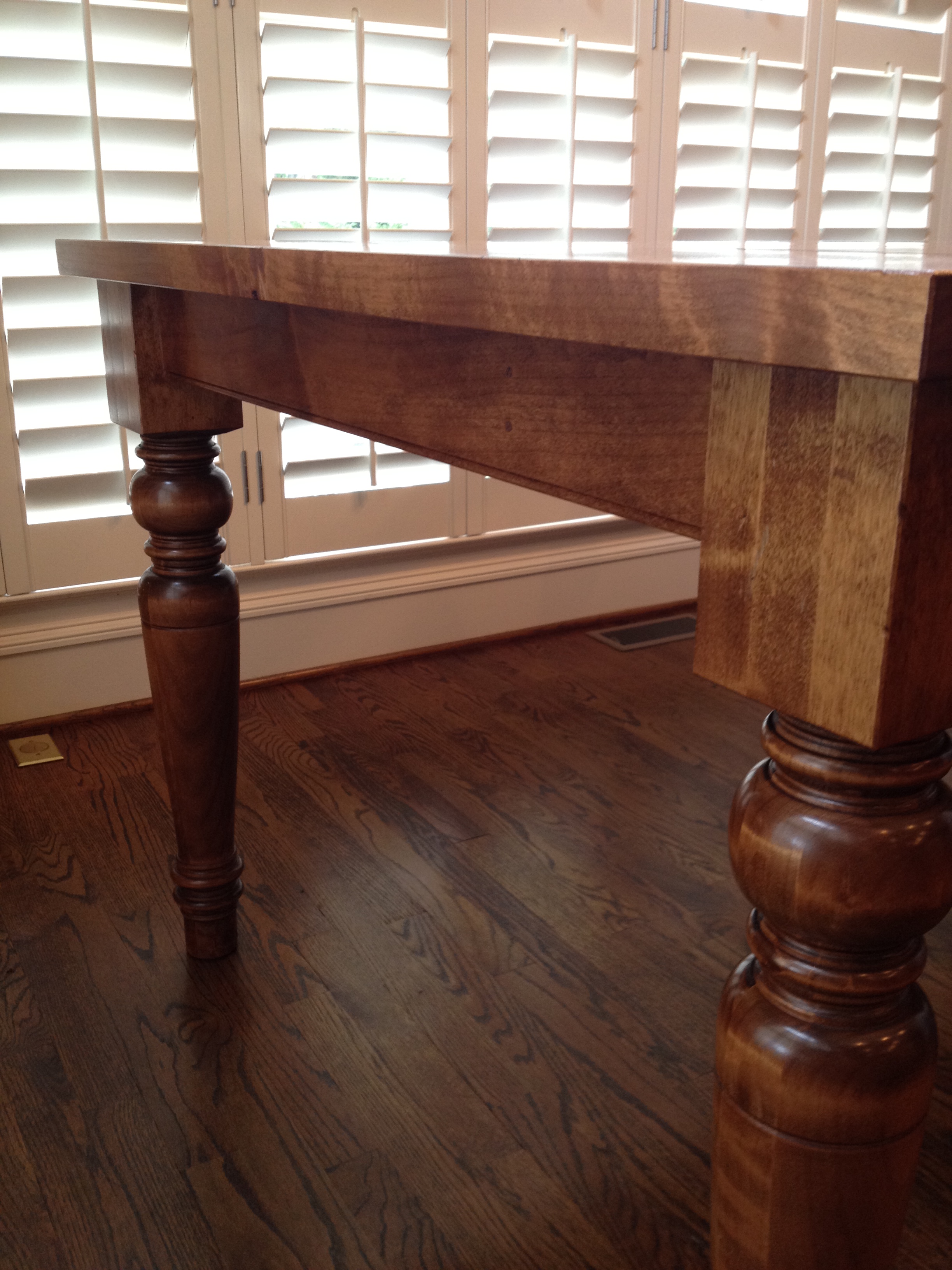 This dining table was built for a friend’s family. It features an all-wood sliding mechanism and 24″ insert. If you look closely you will see where the ability to cut and hand select my own wood pays off in the finished product. The 8″ wide boards that make up the top run all the way down the length of the table including the extension section so that when it’s inserted you can see the grain continuity from one end to the other. This table also features breadboard ends on both halves of the table and the insert. The legs are glued laminations and turned on the lathe.