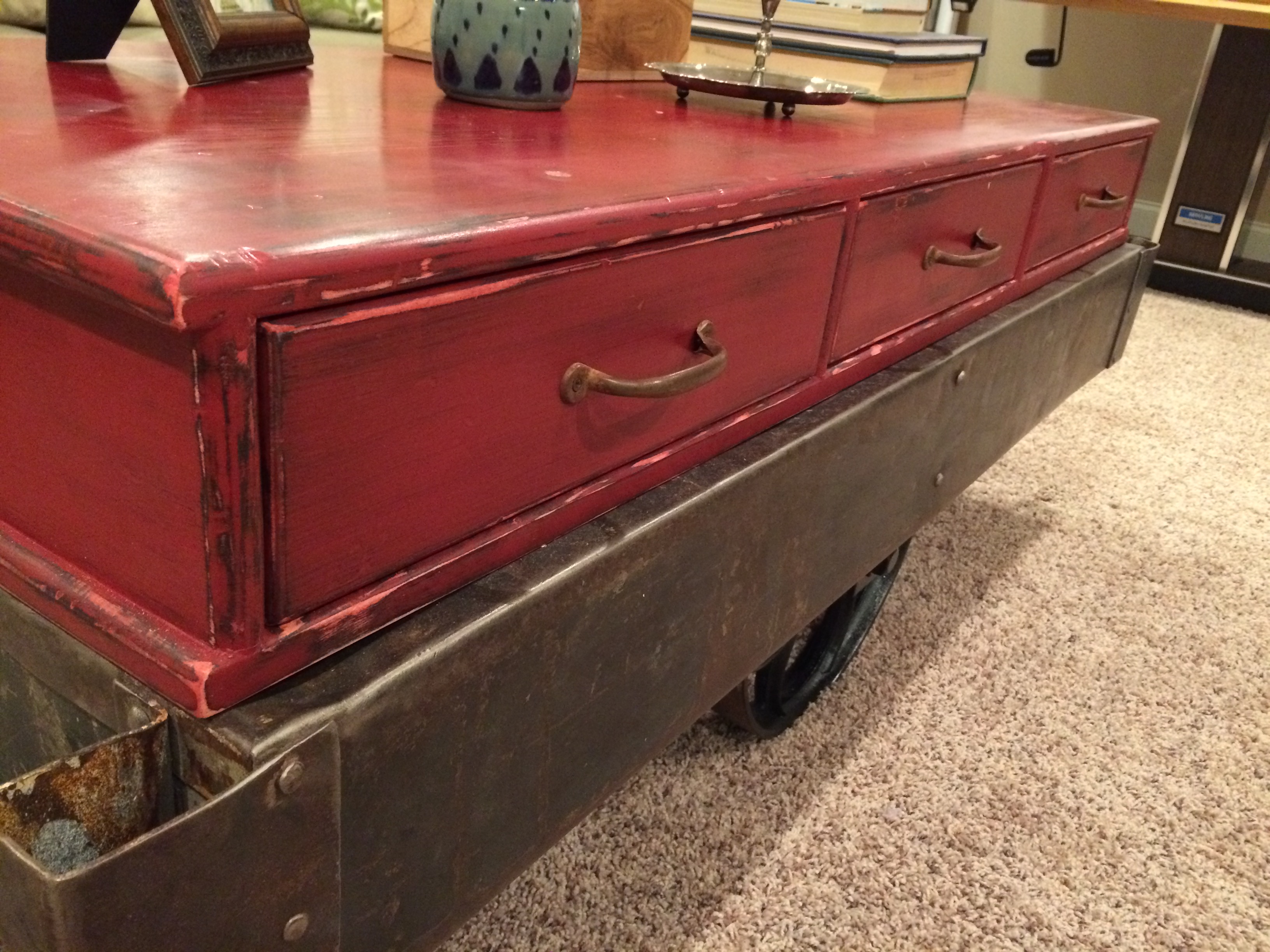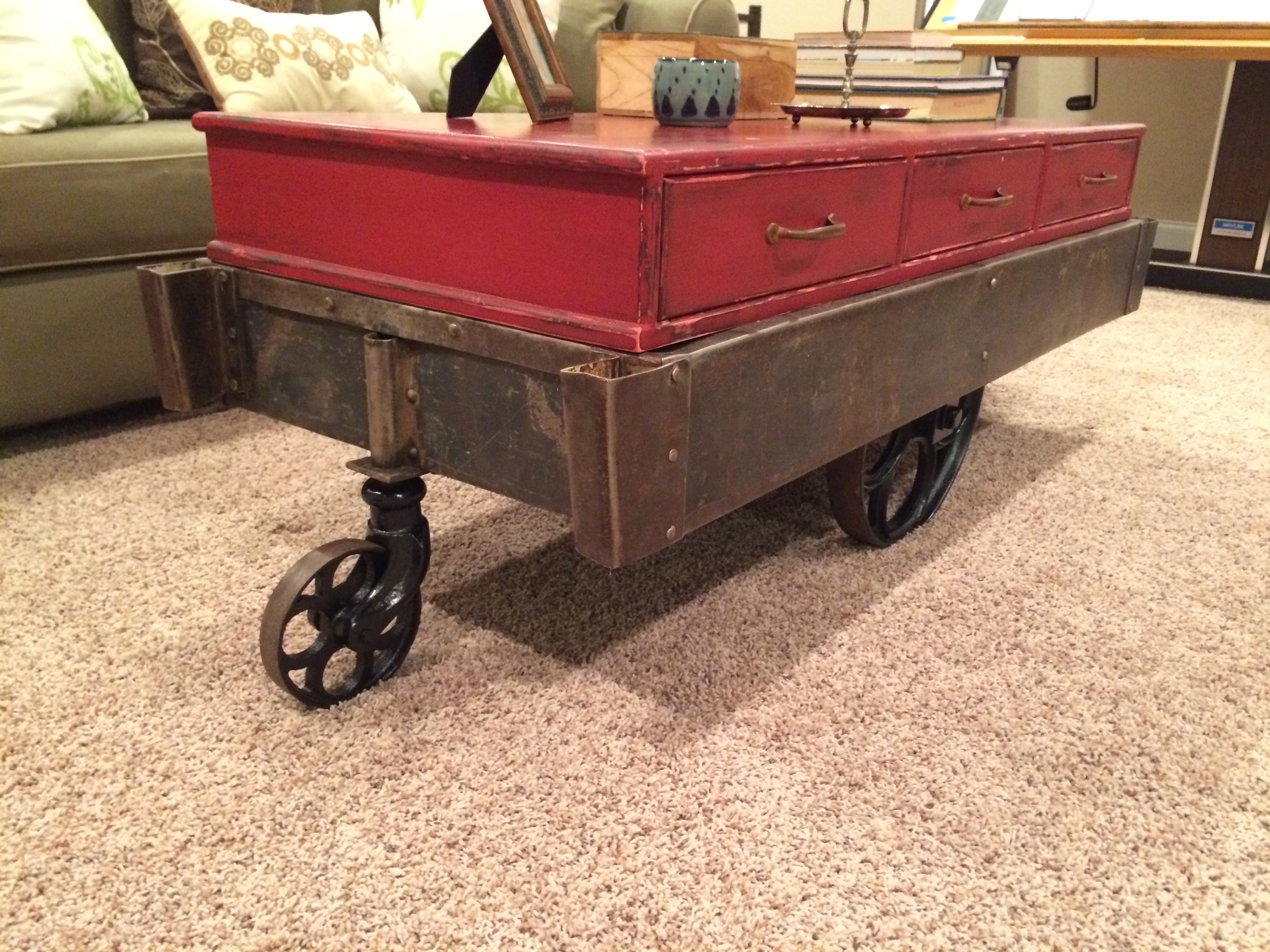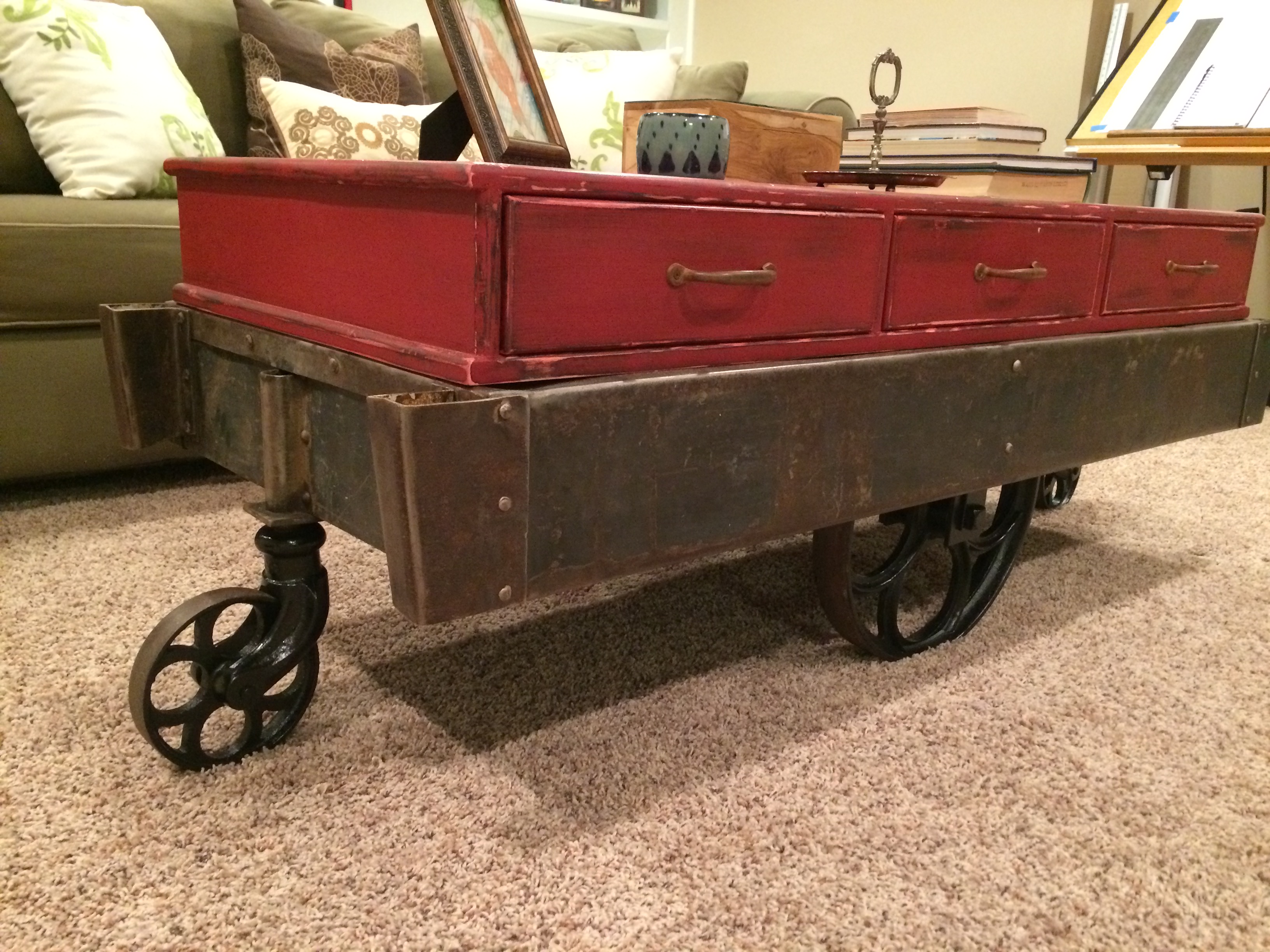 Rare vintage restored Globe Vise & Truck factory cart coffee table with custom built 3 drawer case made from white pine. The custom 3 drawer unit is built with 64 mortise and tenon joints! The drawers and case are built to last as long as the cart and brought to a period appropriate finish. it’s been hand painted 3 times using non-toxic latex paint and distressed between each coat giving it a striking finish. You will be hard pressed to find any cart out there with storage available.