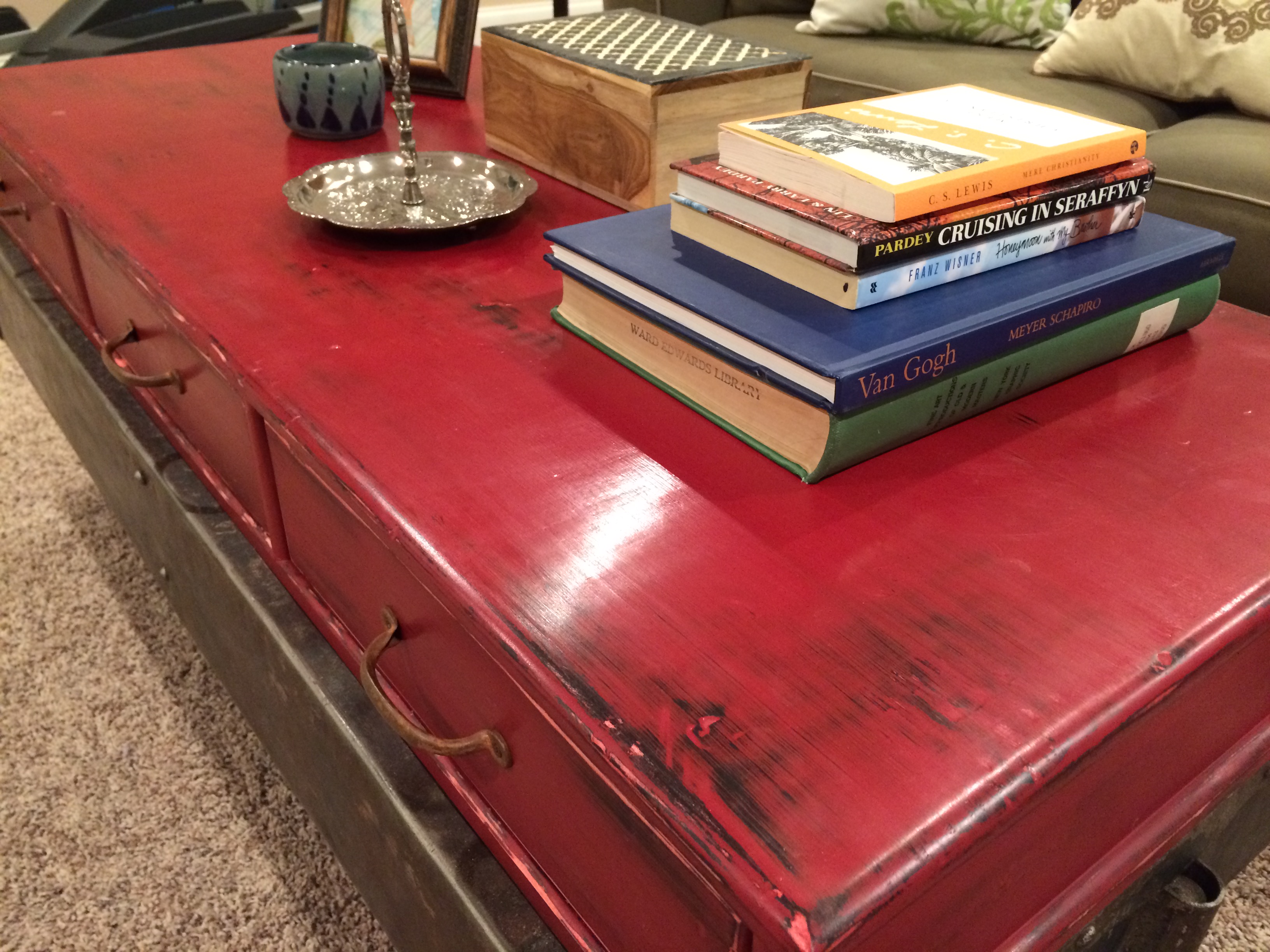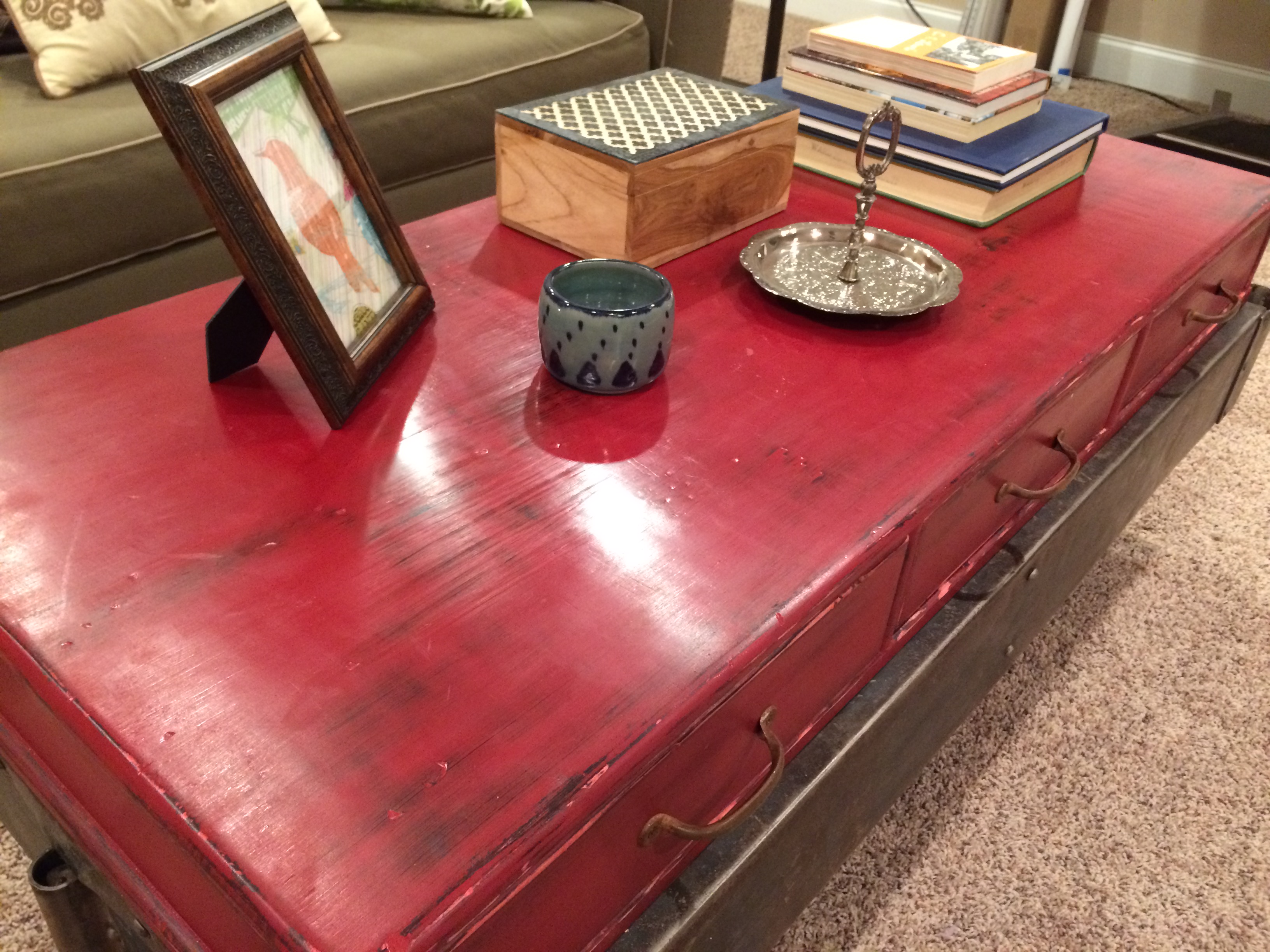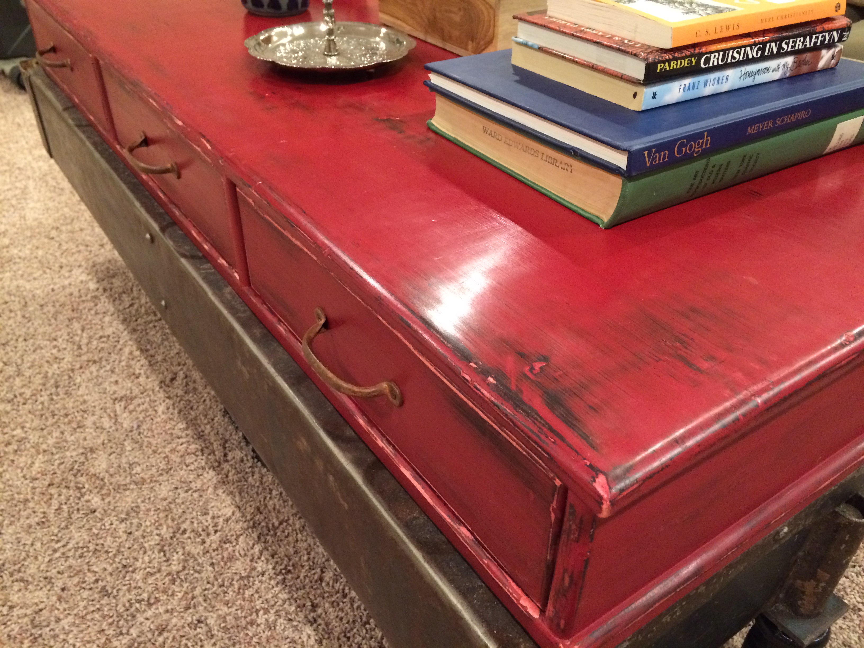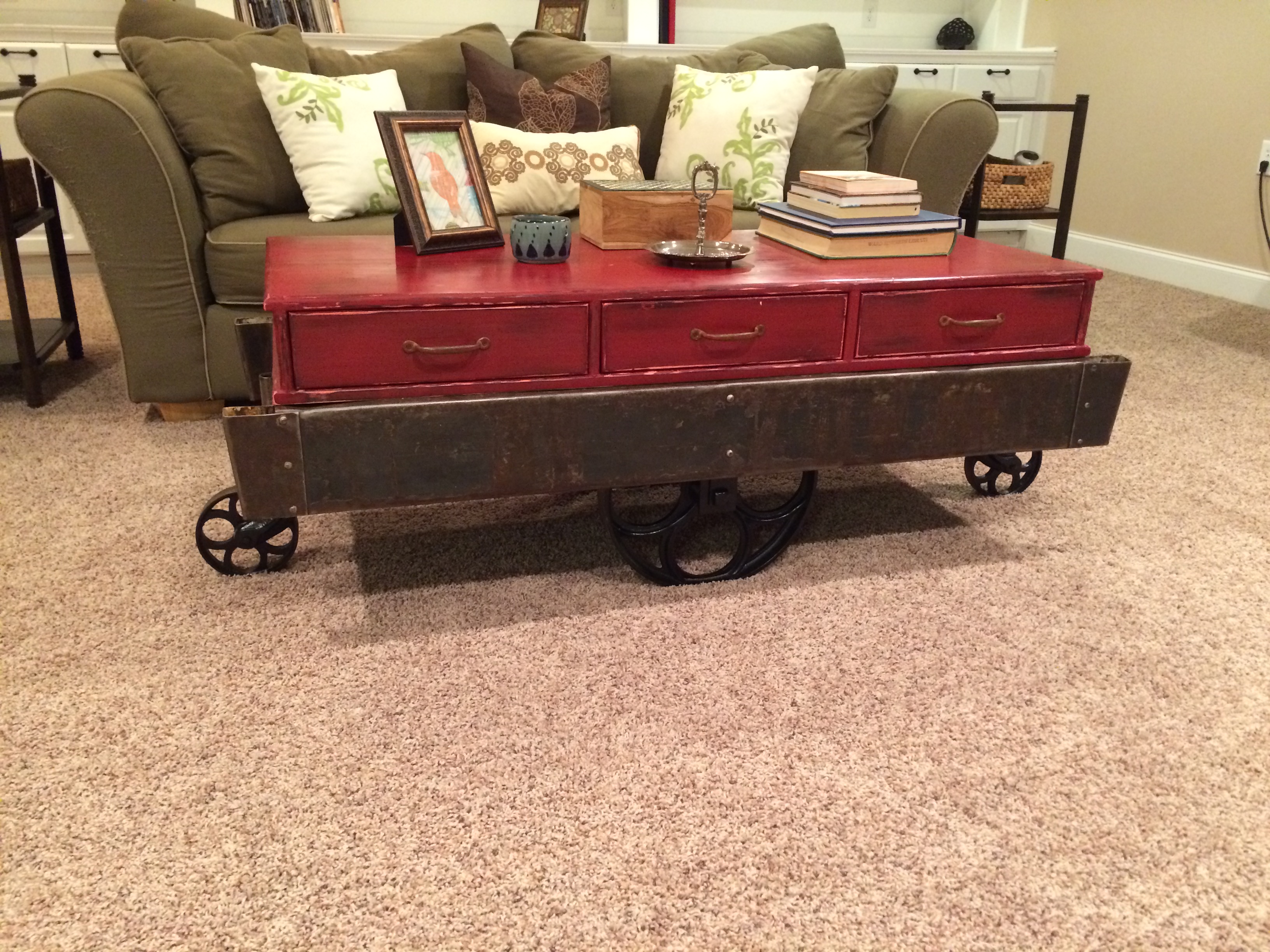 Rare vintage restored Globe Vise & Truck factory cart coffee table with custom built 3 drawer case made from white pine. The custom 3 drawer unit is built with 64 mortise and tenon joints! The drawers and case are built to last as long as the cart and brought to a period appropriate finish. it’s been hand painted 3 times using non-toxic latex paint and distressed between each coat giving it a striking finish. You will be hard pressed to find any cart out there with storage available.