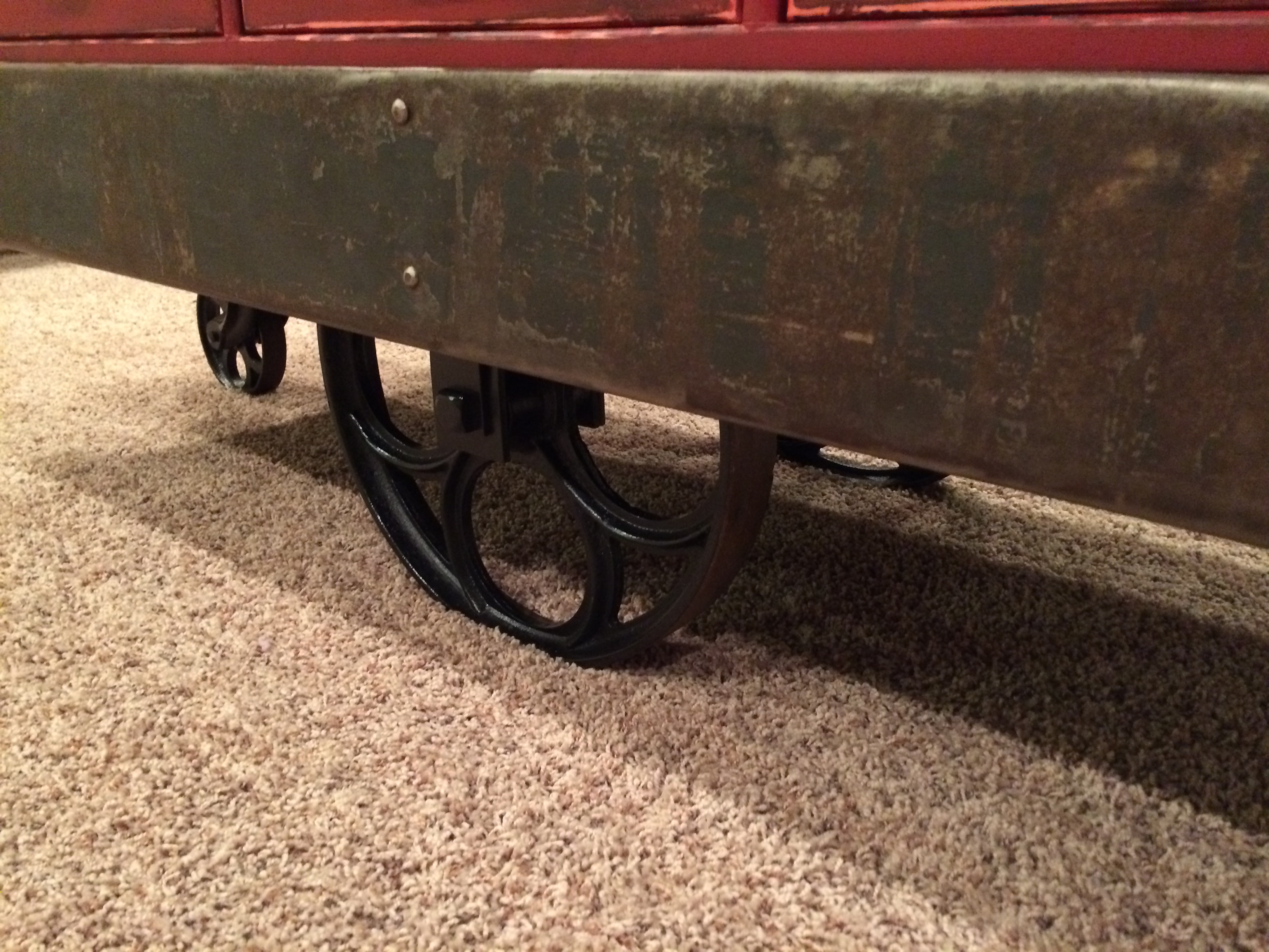 The cart is a very rare Globe Truck and Vise steel cart that was manufactured in 1911, the stencil of the manufacture, patent date, and date of manufacture of this cart are still visible on the wood beam that runs underneath the steel top. I also took the liberty to really clean up the beautiful cast iron wheels and apply a black paint to show off the casting detail and timeless design. Overall the cart is in fantastic condition. This is a fantastic piece of american history with some much needed stylish storage. You can check out more of my work at my store and online.